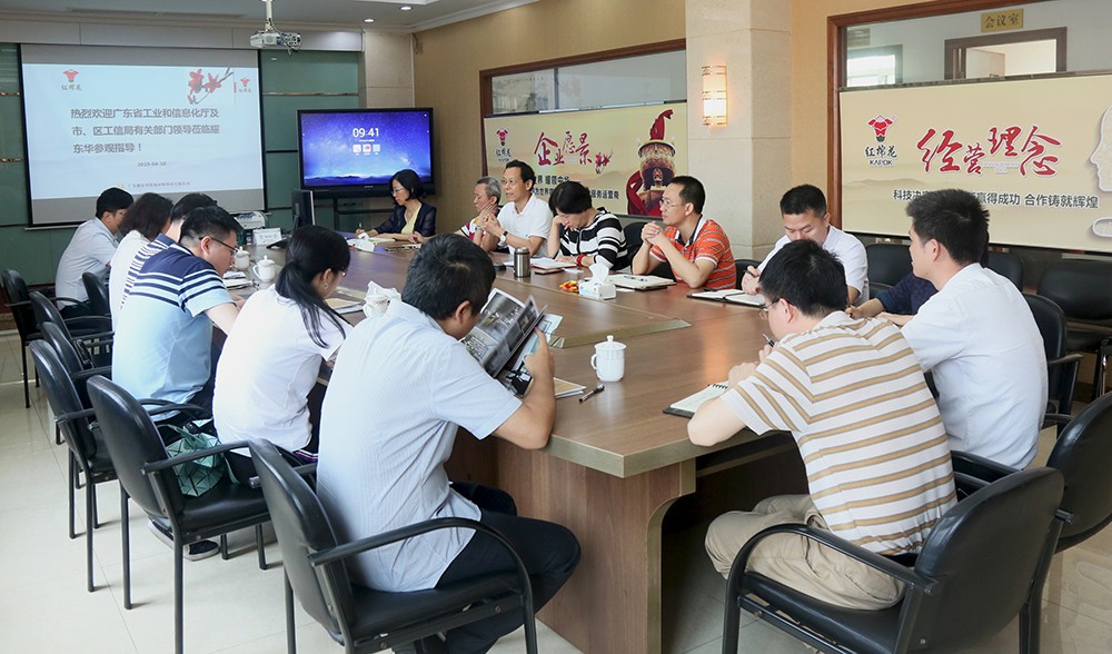 2019年4月10日,广东省工业和信息化厅消费品处处长万淑萍一行,在佛山经济和信息化局工业发展科科长李永强、佛山市南海区经济和科技促进局产业发展科孙泳斌、里水镇经济促进局副局长林中强等陪同下,莅临广东耀东华科技有限公司,开展智能家居产业调研活动。耀东华公司副董事长吴惠仪、总经理罗山鹰、副总经理兼运管中心总监吴惠娟、副总经理兼制造中心总监邝越华等与会座谈。