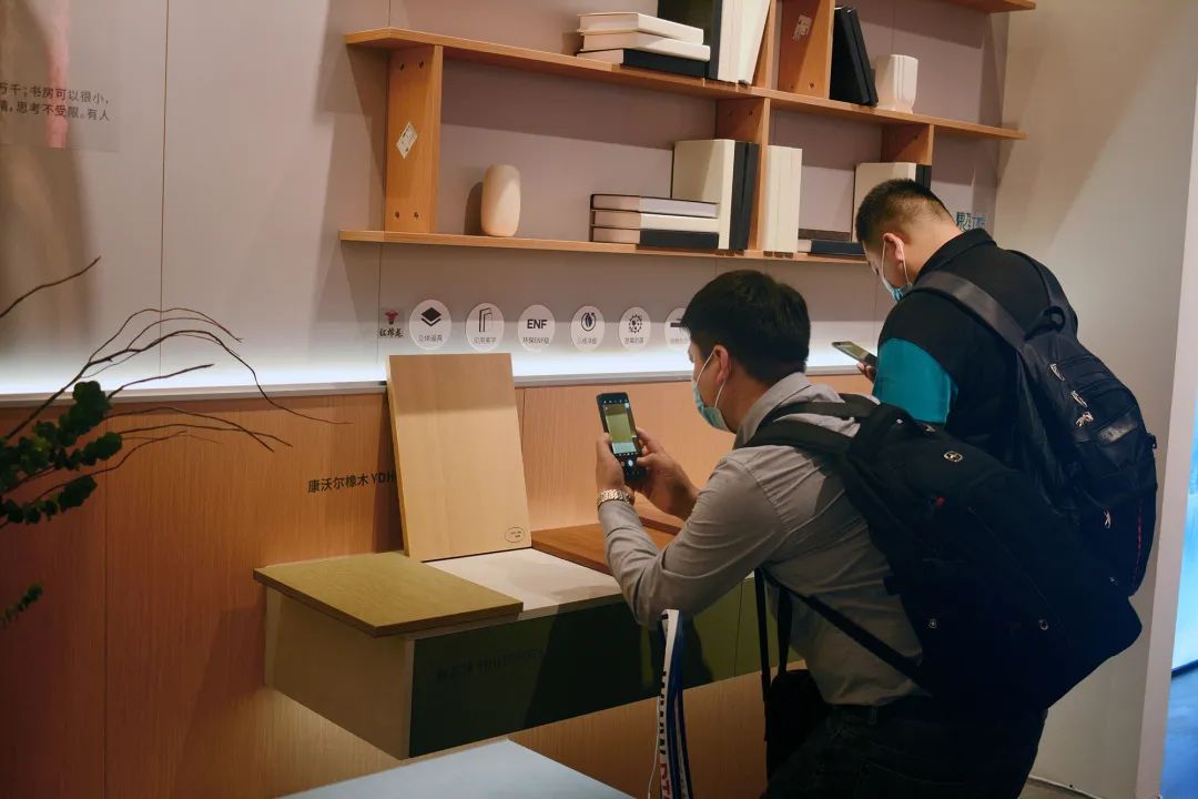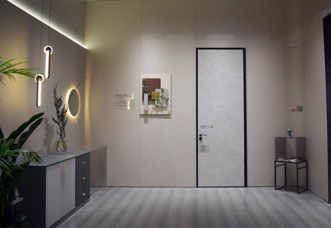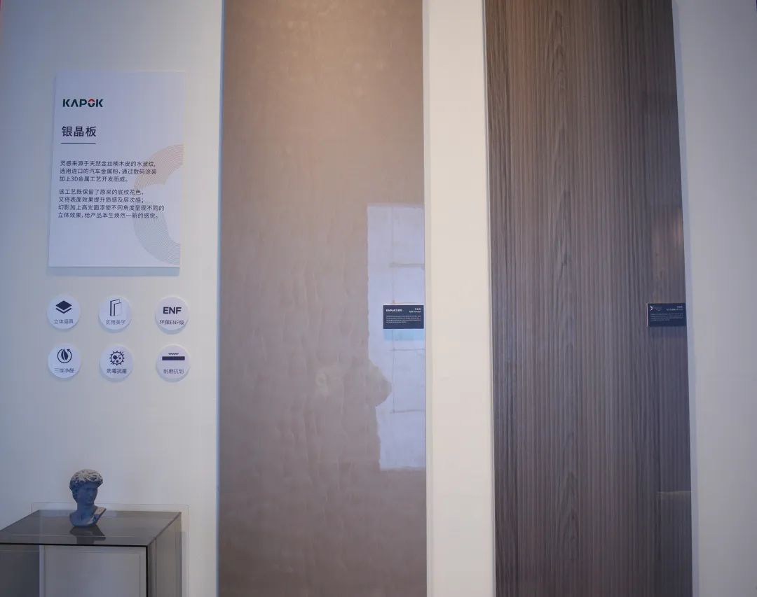 本次展会上的重点产品之一——银晶板,开发灵感来源于天然金丝楠木皮的水波纹,选用进口的汽车金属粉,通过数码涂装加上3D金属工艺开发而成,该工艺既保留了原来的底纹花色,又将表面效果提升质感及层次感,呈现高贵内涵的层次质感。
